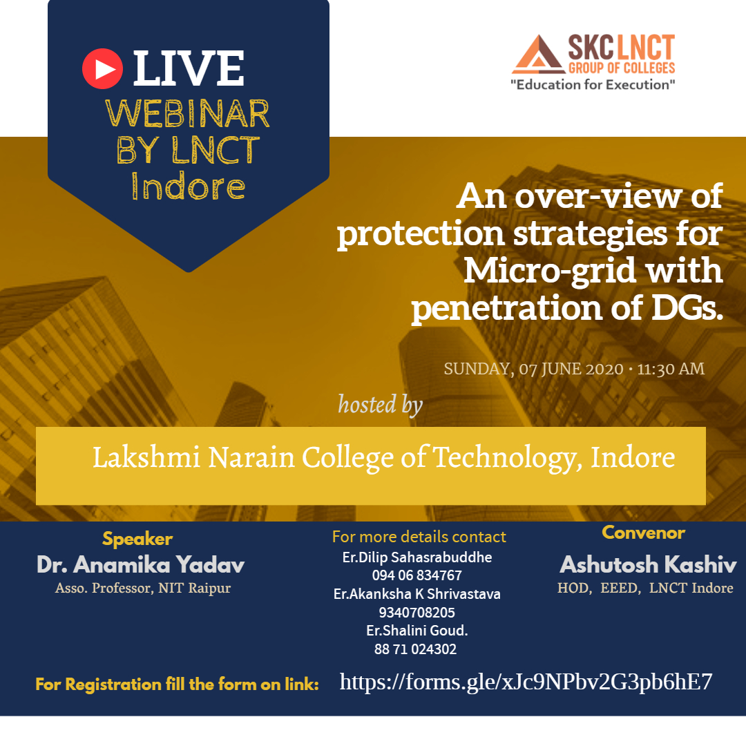 It gives us immense pleasure to announce that A Webinar on “An overview of Protection Strategies for Micro-Grid with penetration of DGS” is going to organized by Department of Electrical and Electronics Engineering, Lakshmi Narain College of Technology Indore